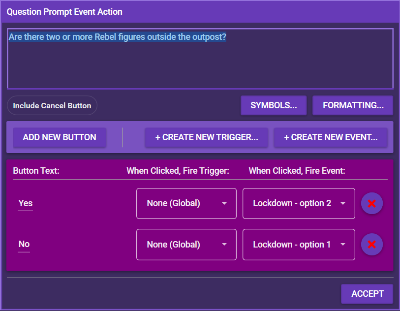 This displays a window with a question and various clickable buttons. You can add the question and multiple buttons and link the buttons to existing triggers or events (or create new ones). When the button is clicked, the linked trigger or event is fired. You can also toggle whether or not the question prompt shows a "Cancel" button, allowing the players to skip the question without answering it.
