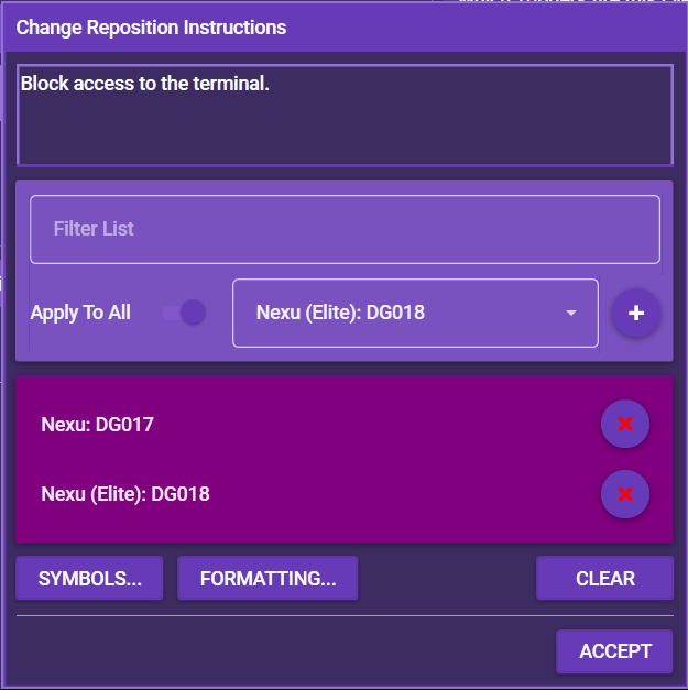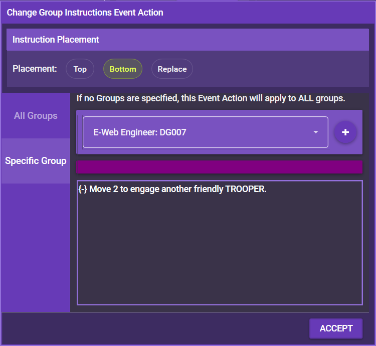 With this event action, you can change the reposition instructions that are displayed in the instruction window. You can add specific groups or simply set the toggle to Apply To All to have the change affect all groups.