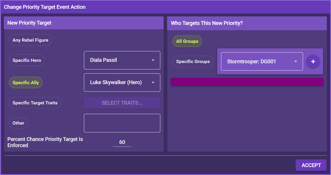 By default, the app randomly targets any healthy Rebel figure. With this event action, you can change the target for either all groups or a specific group. You can select specific heroes / allies or simply enter a text string, such as the closest weak point.