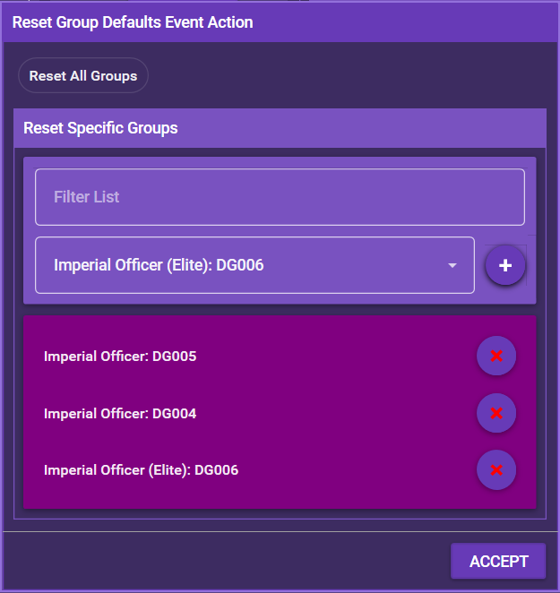 With this event action, you can restore a group's default settings. That means you remove any name changes, special instructions and anything else you might have altered. Either add specific groups you want to reset, or simply check Reset All Groups.