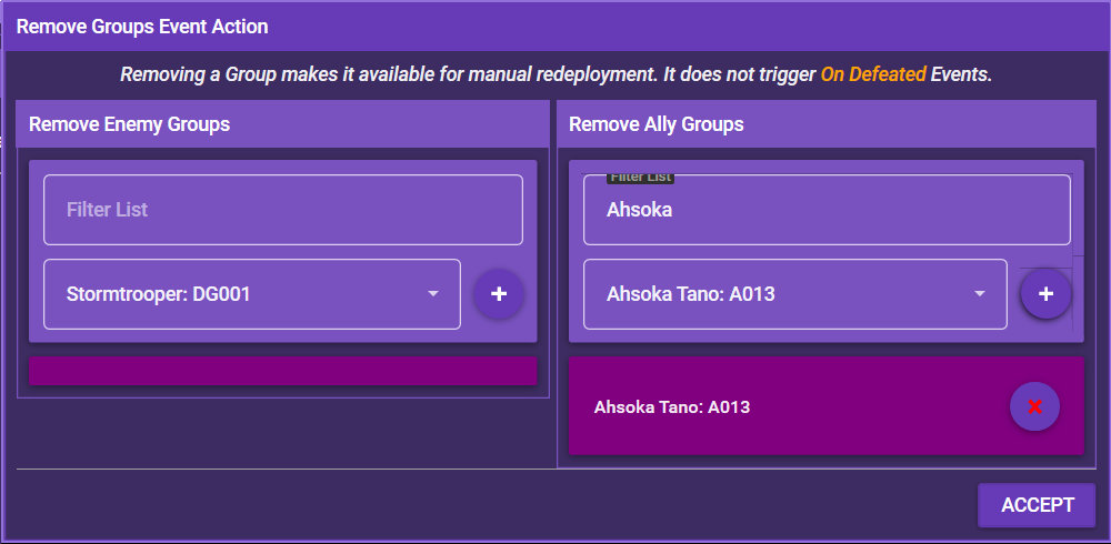 With this event action, you can remove a deployed group (enemy or ally) from the mission. Removing a group this way does not trigger any events or triggers that rely on the group being defeated. A group removed in this manner can still be redeployed by a Deployment event action.