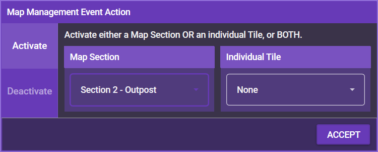 Map Management allows you to reveal or hide map sections and individual tiles. If you want to reveal sections or tiles, choose Activate, if you want to hide them, choose Deactivate.