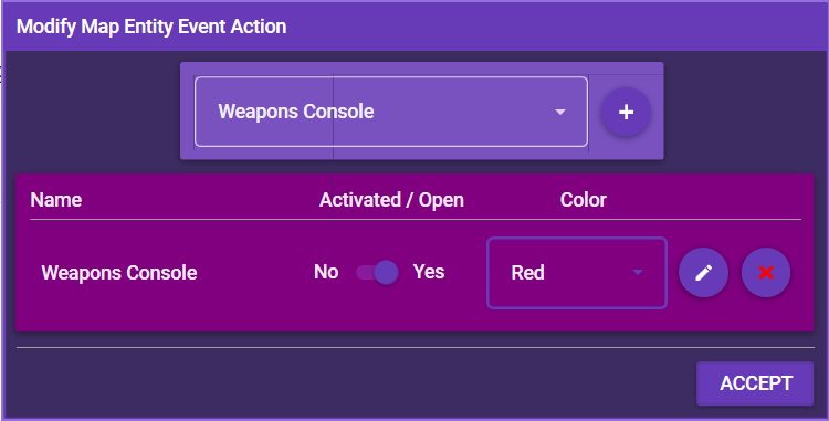 This event action allows you to activate or deactivate a map entity (for example tokens, deployment points or space highlights) and change their color and properties (such as description and interactions). Simply select the entity from the dropdown list and click the + symbol.