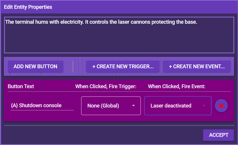 Here you can edit an entity's description and interactions, for example the available buttons and what triggers are fired when they are clicked. See Creating Maps and Map Entities for details.