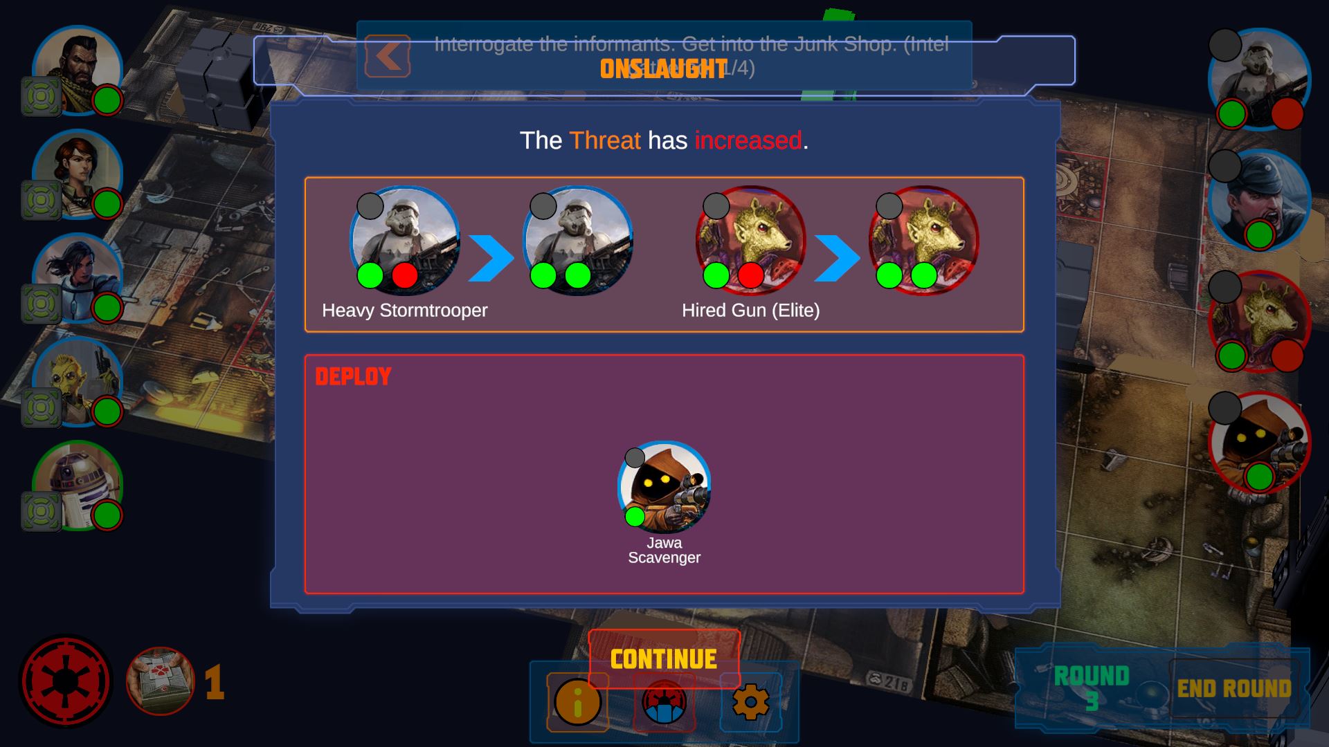 At the end of the round, the Imperial Commander app determines what groups to deploy with the accumulated threat. Deployments can reach from periods of treacherous calm, where no new enemies are deployed, to all-out onslaughts in an effort to wipe the Rebels off the map. The Rebel players do not need to keep track of threat - the app does that for them. All the Rebel players need to do is deploy the figures displayed by the app to the map.