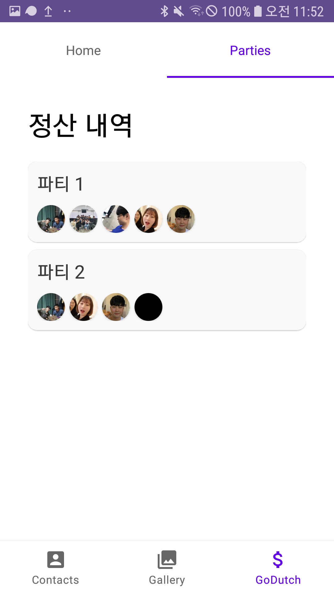 The following page shows the information of the party. The members inlcuded in the party are shown on the top, and the list of transactions are shown below. Clicking `정산하기` shows the amount of money and the receiver that each member has to send to.