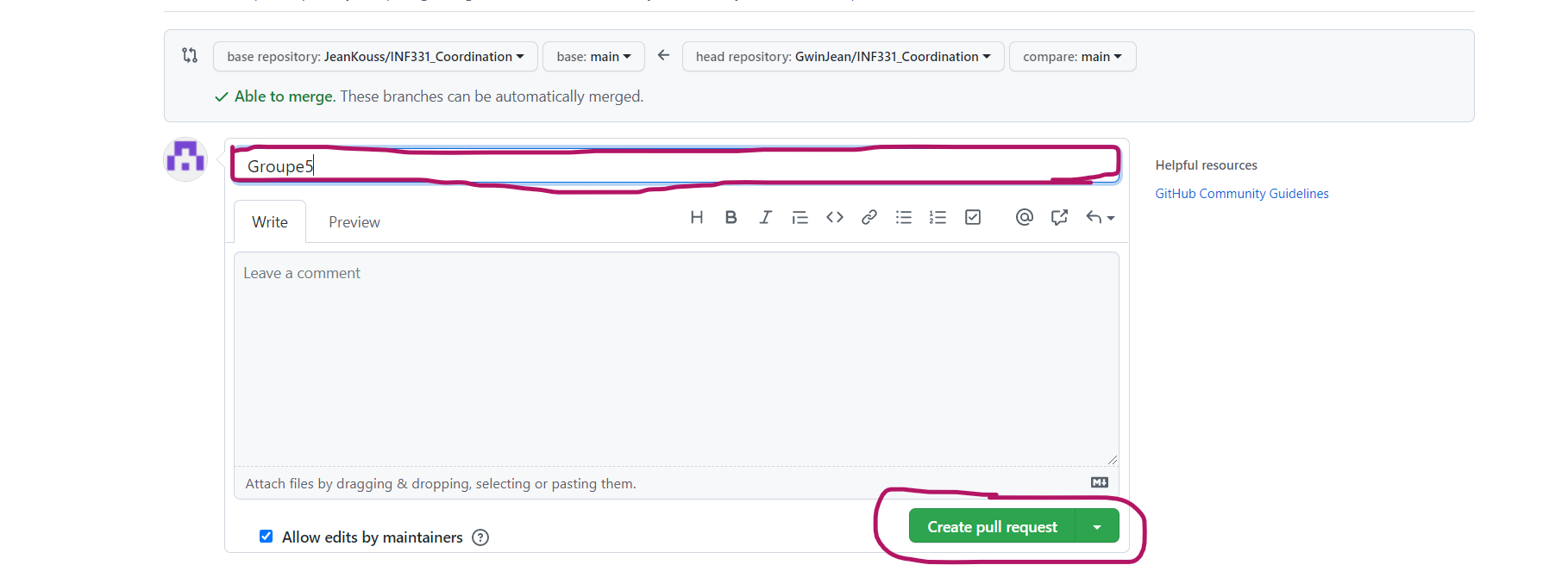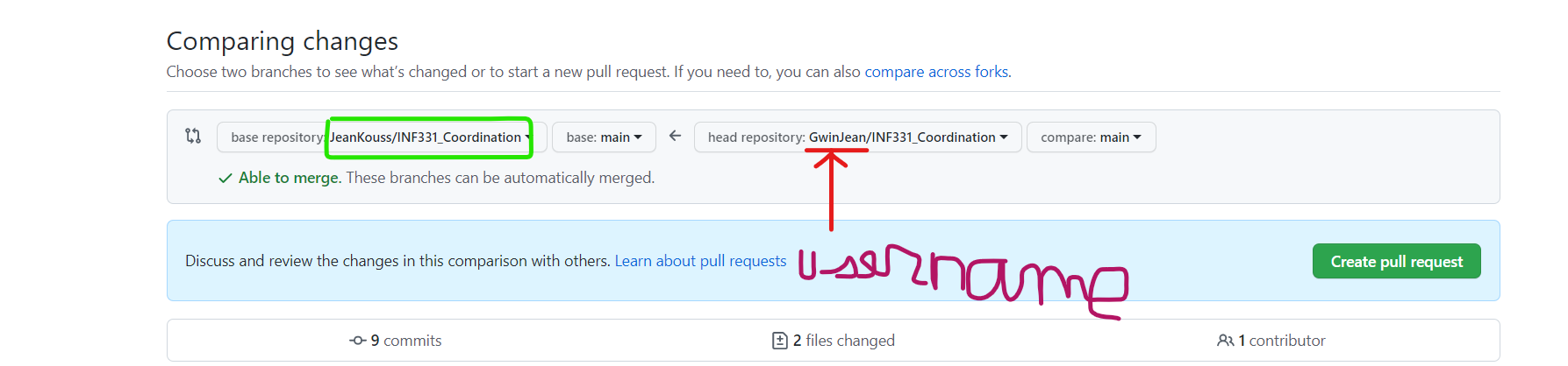 Cliquer sur "Create pull request" et entrer le nom du groupe dans la partie commentaire. Vérifier bien qu'à droite, on a username/INF331.... et l'élément à gauche (encadré en vert)