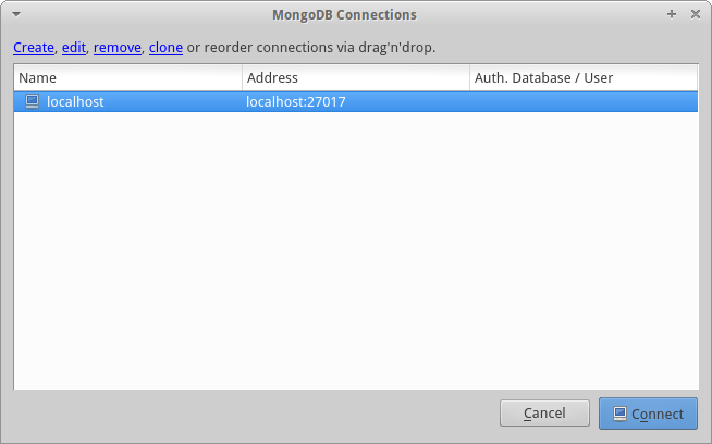 👉 Start Robo3T. The first Robo3T screen asks what database you want to inspect. The default (localhost:27017) is exactly what we want, so just press OK. (the screenshot is from RoboMongo, an earlier version of Robo3T)