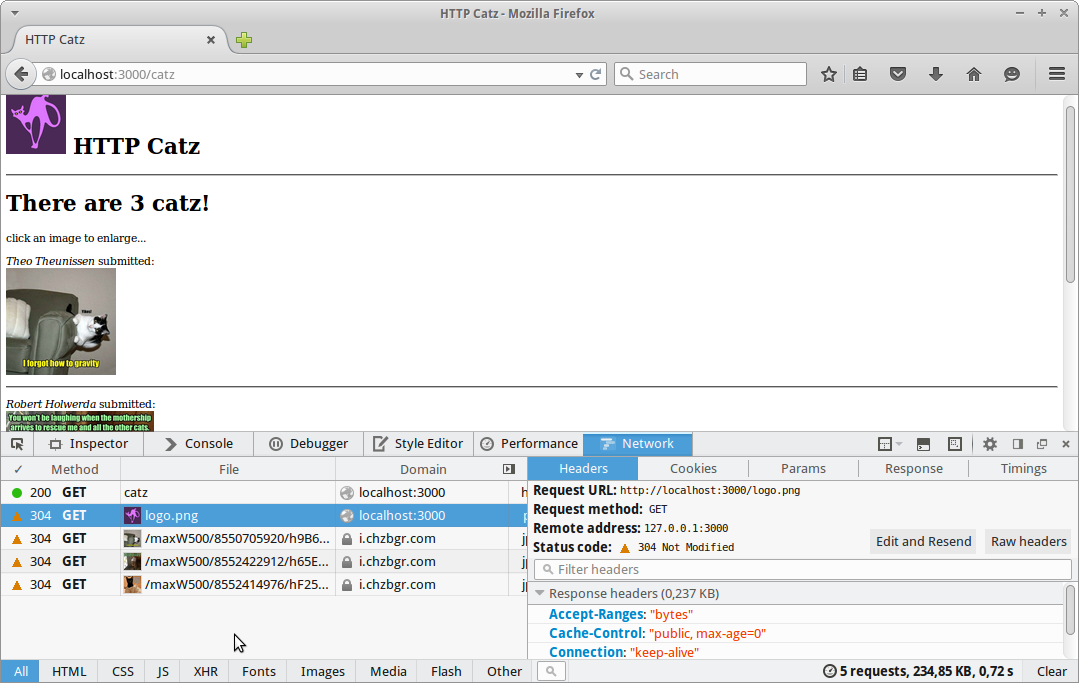 If you look at the HTML for the cat list, you'll see that one of the images has a URL that's rather different from the URLs of the other two. And yet, looking at the Network panel, you can see that all images are loaded from the same site, using very similar URLs.