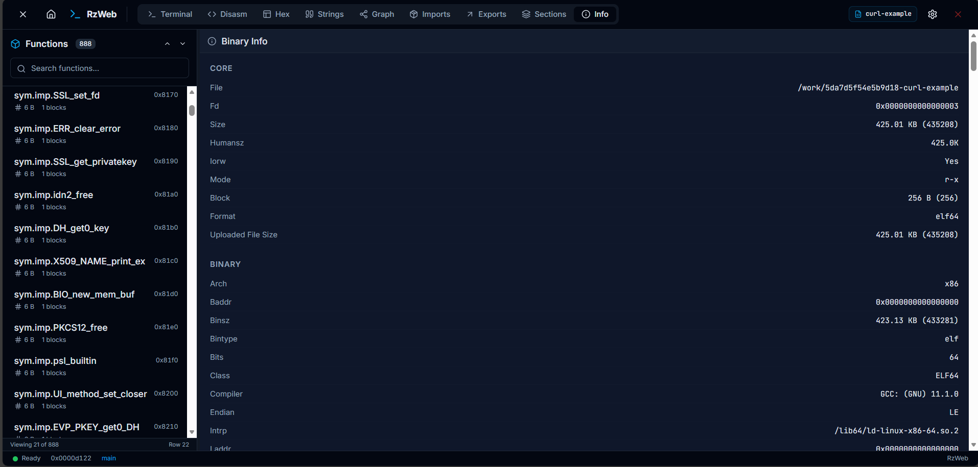 - Analysis data such as functions, strings, imports, exports, sections, and graphs