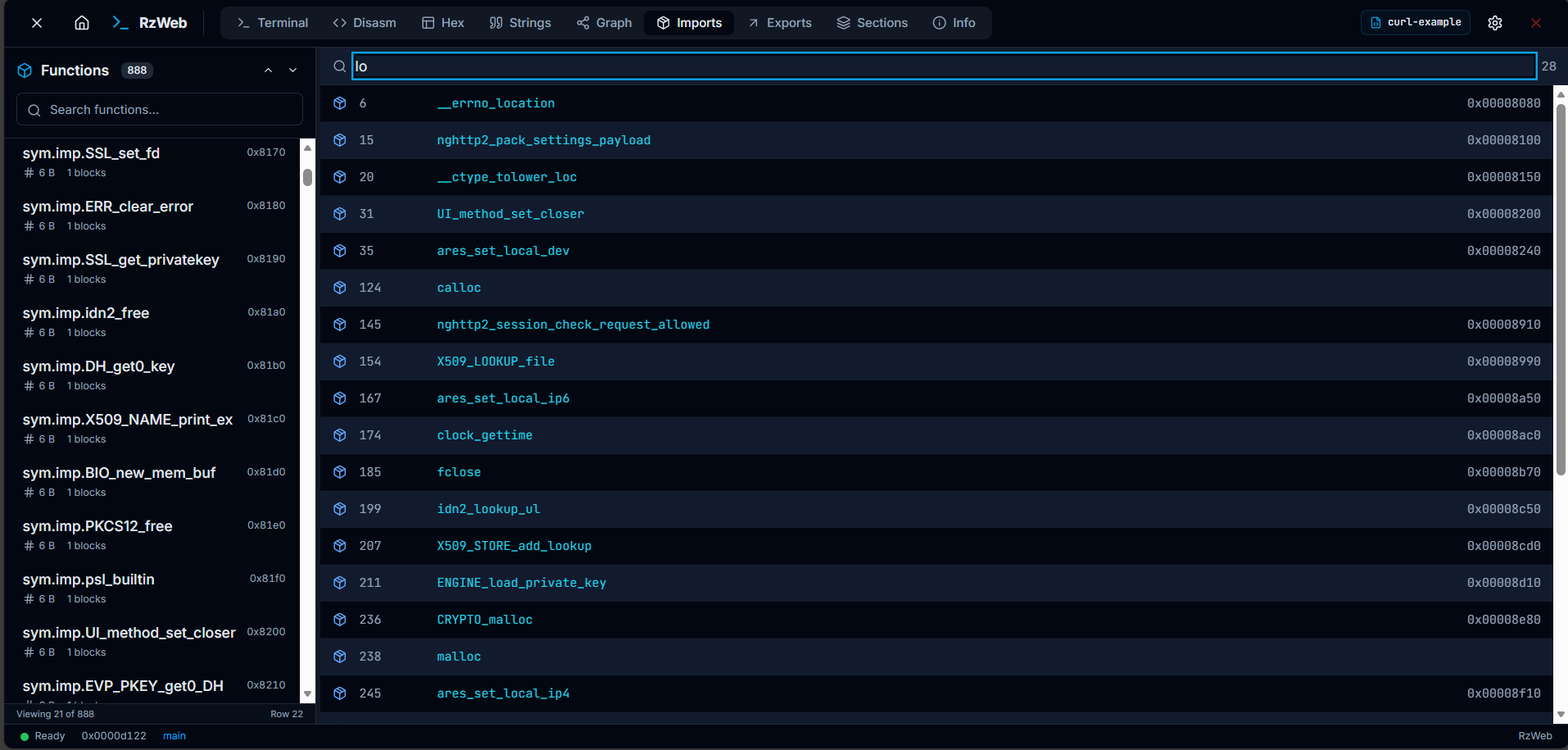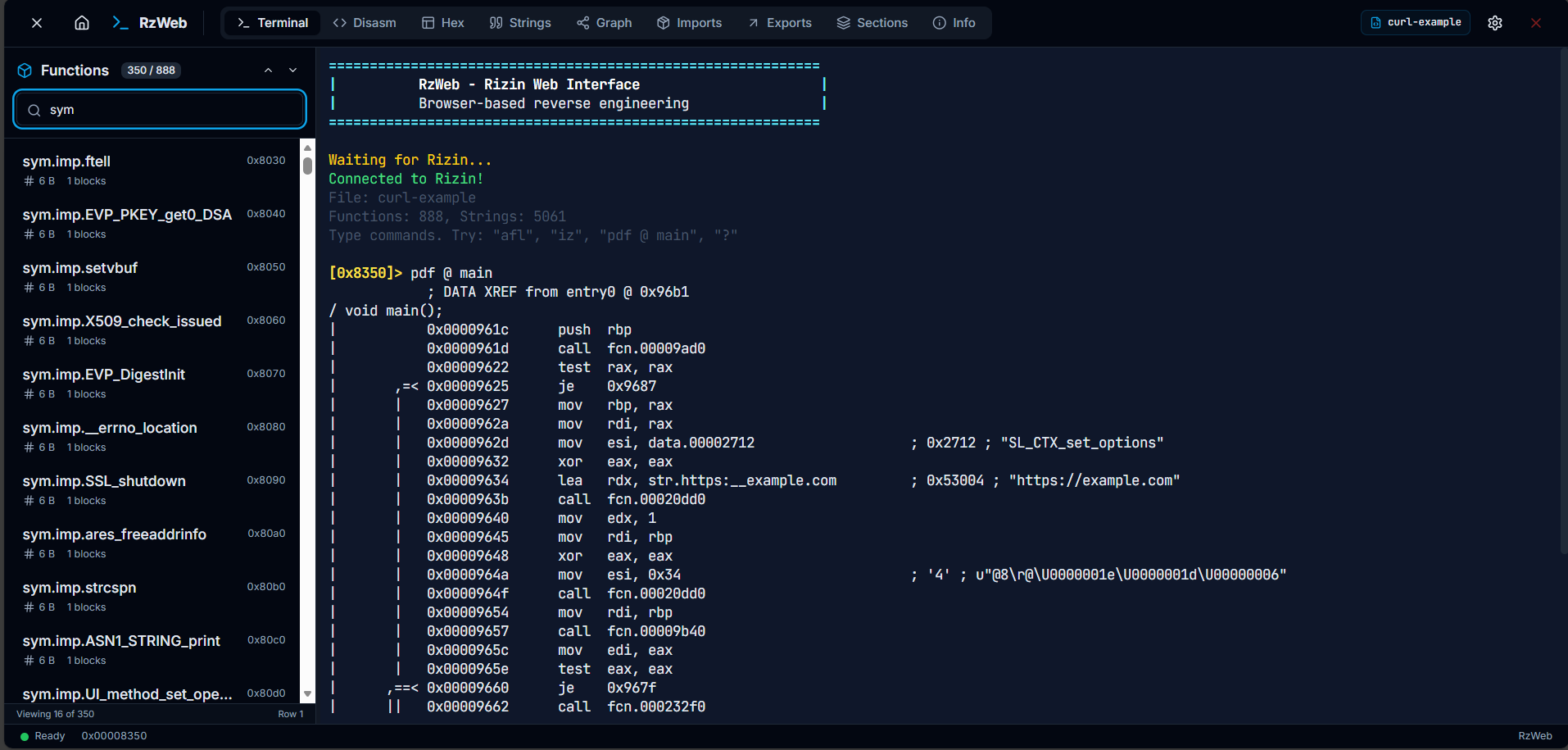 console.log(cmd(session, 'aflj'));The build script applies the compatibility fixes needed for Emscripten automatically. That includes the browser-thread stubs, the libzip portability fix, the io_shm portability patch, and the target-local Meson changes that attach the rzweb_* session wrapper only to the rizin binary where it belongs.