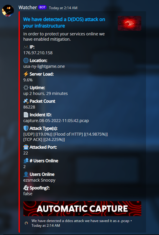 Webhook uses discords intergrated webhooks to display the notifications as a bot_nat-type Users: This shows the discord bot Username so if you want it Gorilla it will be called Gorilla as the bot username Serverheader: Displays the topmost header of IP I would recommend having this as your hostname Title: Displays at the topmost of the screen the text of the ddos notifications at the top Description: Additive to the title shows the text below the bottom of the title header Color: Uses decimal format on color type have this to change hte discord notis color Footergif: Shows the footer animated circle License: License just so we can verify you through our api system Image: Sets it by the title the image to right of the title. Url: Will add a clickable link to the title header Banner: Shows the animated banner at the bottom showing the feautures Footer: Add custom footer text to the ddos notifications