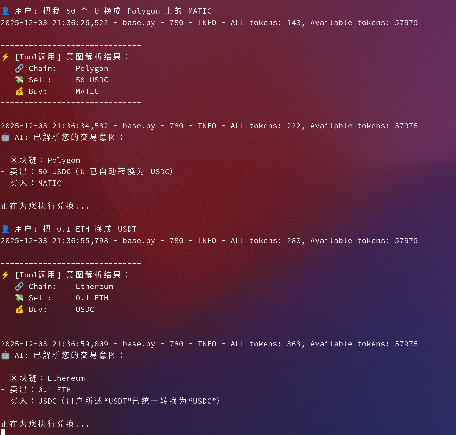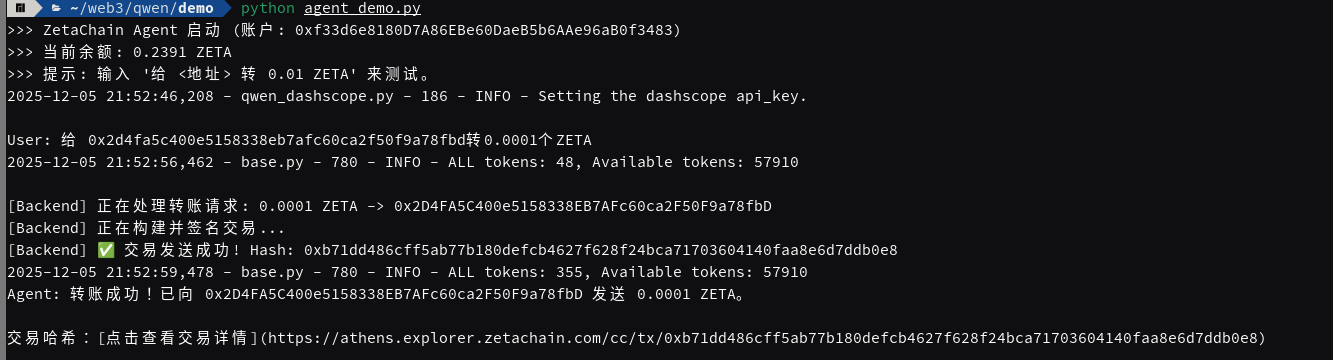 输入: 自然语言指令(如“给 Alice 转 0.001 ZETA”)。