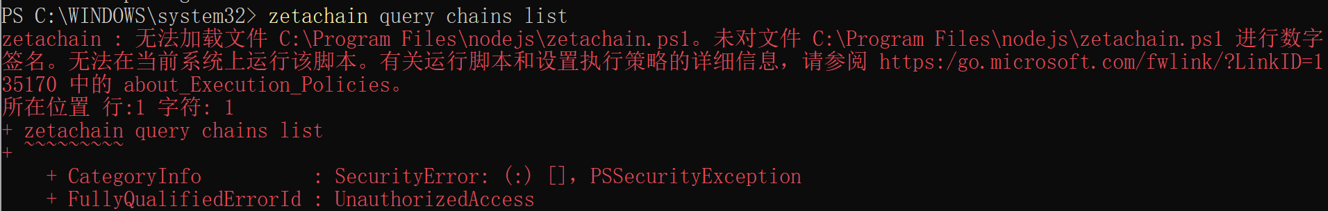 问题原因: Windows 系统出于安全考虑,默认禁止运行未签名的脚本(包括 npm 安装的全局包,如 zetachain.ps1)。这不是 ZetaChain 的问题,而是 PowerShell 的 执行策略 (Execution Policy) 设置导致的。