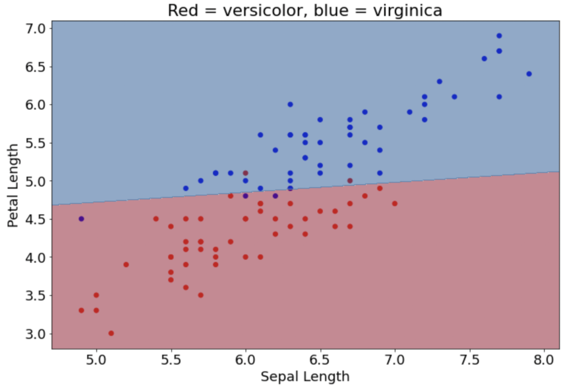 A logistic regression model takes in data and predicts the probability of an event existing (e.g. if someone will win or lose, if it will rain or not etc.). A single logistic regression model inputs data and linearly separates the events. For example, Figure 1 is a visualization of a logistic regression model that predicts the species of an iris (vericolor or virginica) based on data of petal and sepal length. The data is able to be separated linearly.