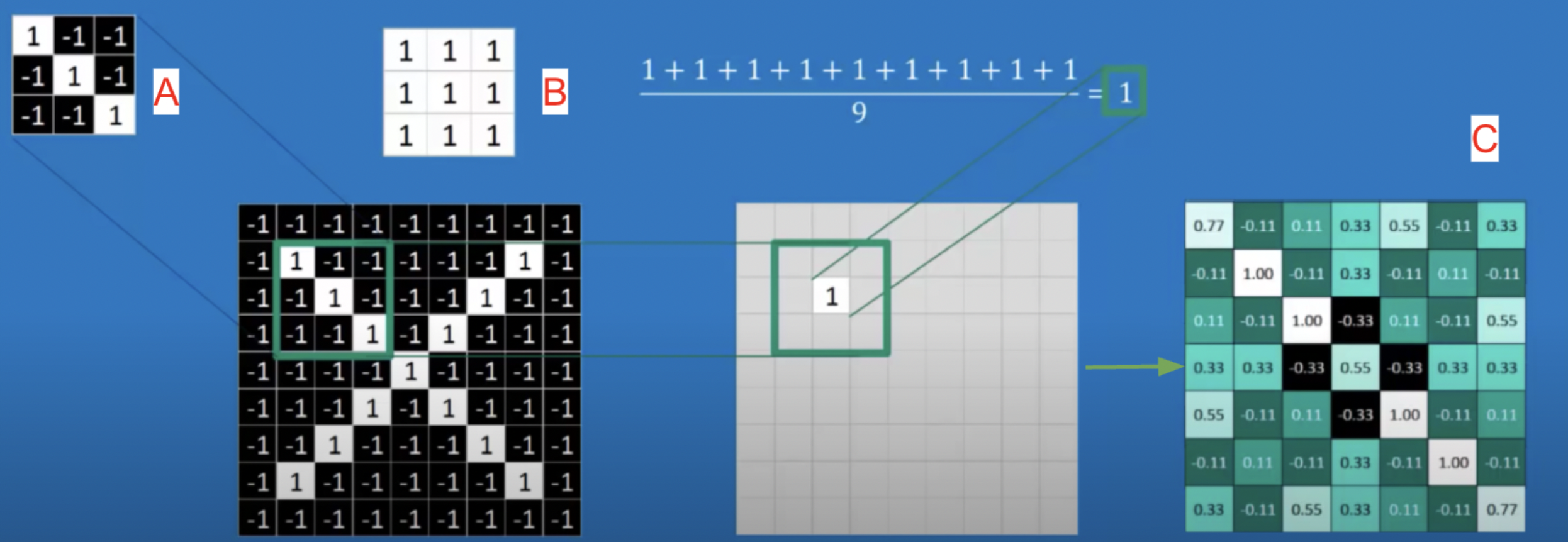 More than just a simple neural network, convolutions are needed for image data. This is because with images, the position of image pixels in relation to each other are important and cannot be evaluated through simple neural network methods. Convolutions find the spatial relationship between features in an image by sliding a filter through the image. For example, in Figure 4 a filter labeled A of a 3 pixel downward slant passes through an input image of an X shape. For each set, the filter is compared to the input image, as shown in label B, through dot multiplication. Label C shows the output after convolution, which represents where the filter pattern appears.