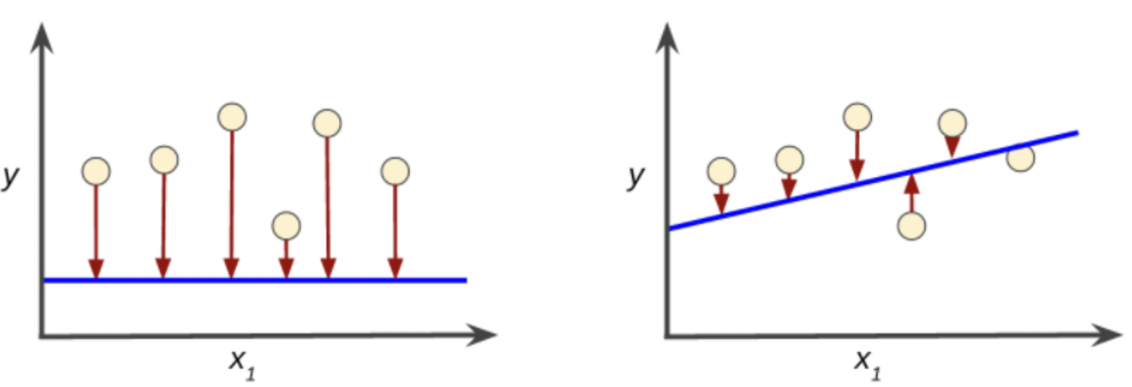Loss is a number that indicates how far the model’s prediction was from the example. A loss of zero means the prediction is perfect, but when loss is greater that means loss is increasing. In figure 6, the arrow represents loss, the blue lines represent predictions. The left graph contains more loss than the right and thus is further from zero.