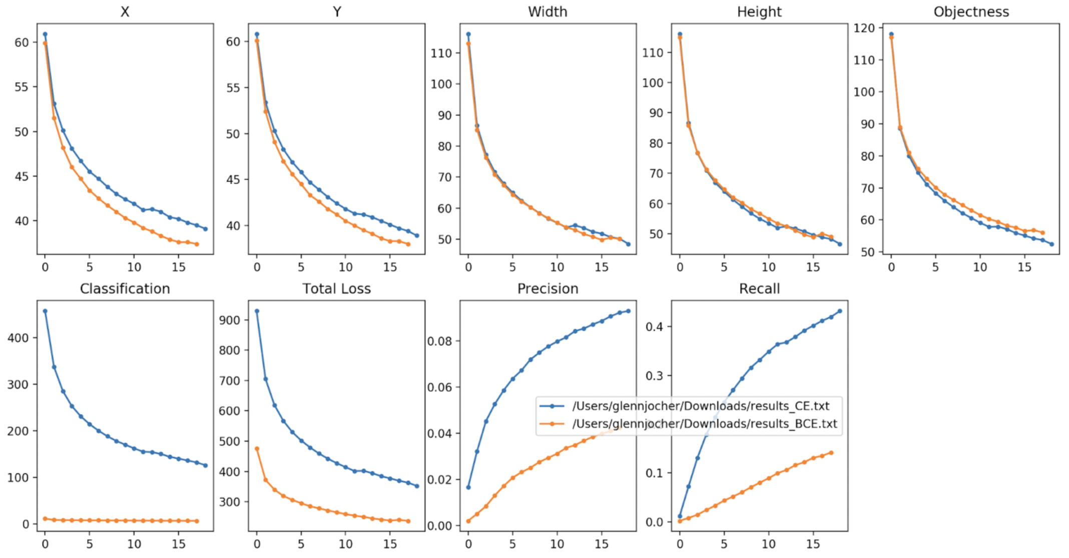 Figure 7: Blue is CrossEntropy and orange is Binary Cross Entropy (BCE)