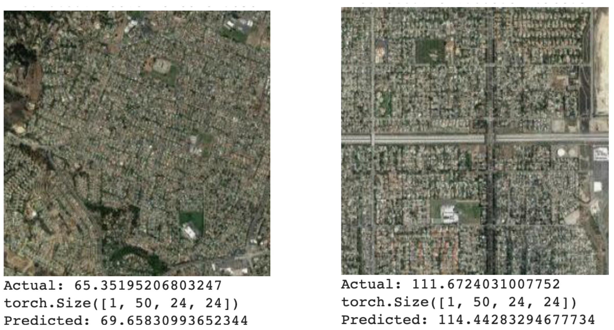Figure 10: Two examples of satellite images with their actual and predicted average incomes