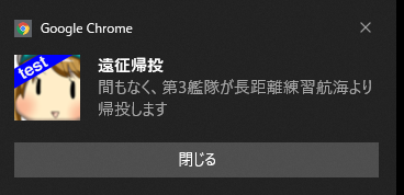別の作業を行っている際に[閉じる]ボタンを押下するまでモニタに遠征帰投通知が表示され続け、