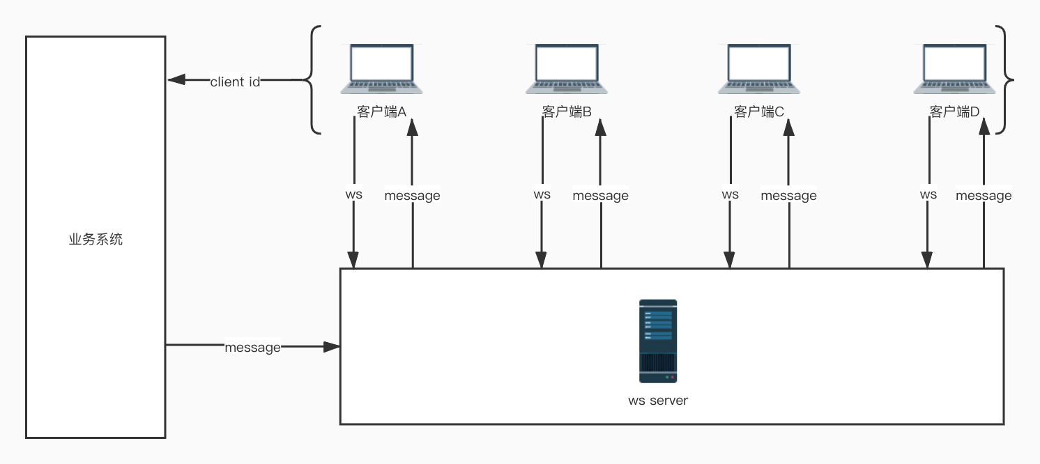 - 业务系统拿到client id之后,通过http发送相关消息,经过nginx负载分配到一台ws服务器;