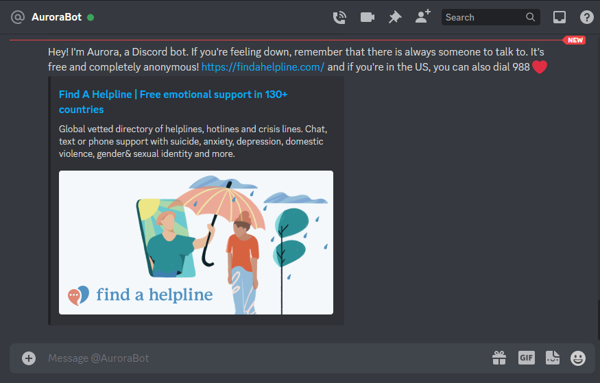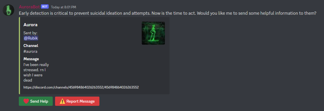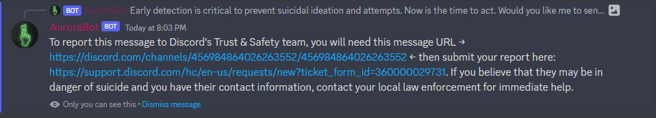 A private channel will be created to notify Server Administrators when concerning content is detected in a user's message. An Administrator can review the message and send support links to the user via DMs with a single button press. A direct URL to the message is attached to assist with reporting the message to Discord's Trust & Safety team.