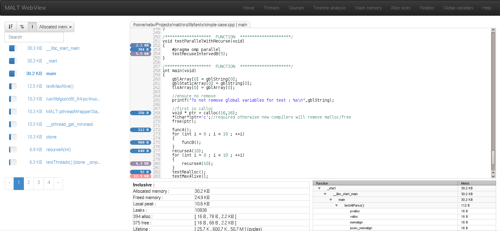 {YOUR_PREFIX}/bin/malt {YOUR_PROGRAM} [OPTIONS]You can get better performance but less detailed stack by using option -finstrument-function or similar for your compiler. Then, you need to tel MALT to use the "enter-exit" stack mode :