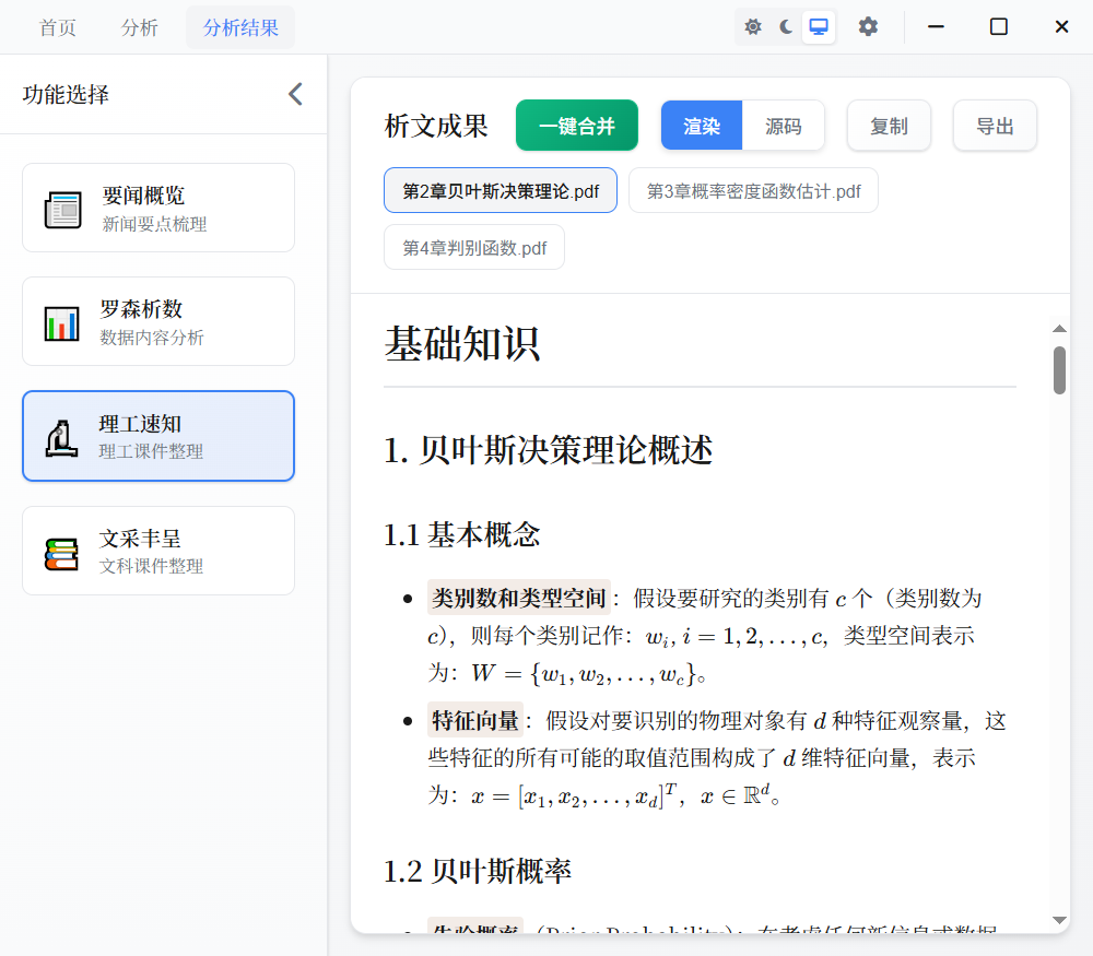 软件内自带有 Markdown 及 LaTeX 格式的渲染,若出现渲染错误,可将 Markdown 格式文本完整复制到外部进行查看,也可点击“导出”按钮进行 PDF 文件导出。