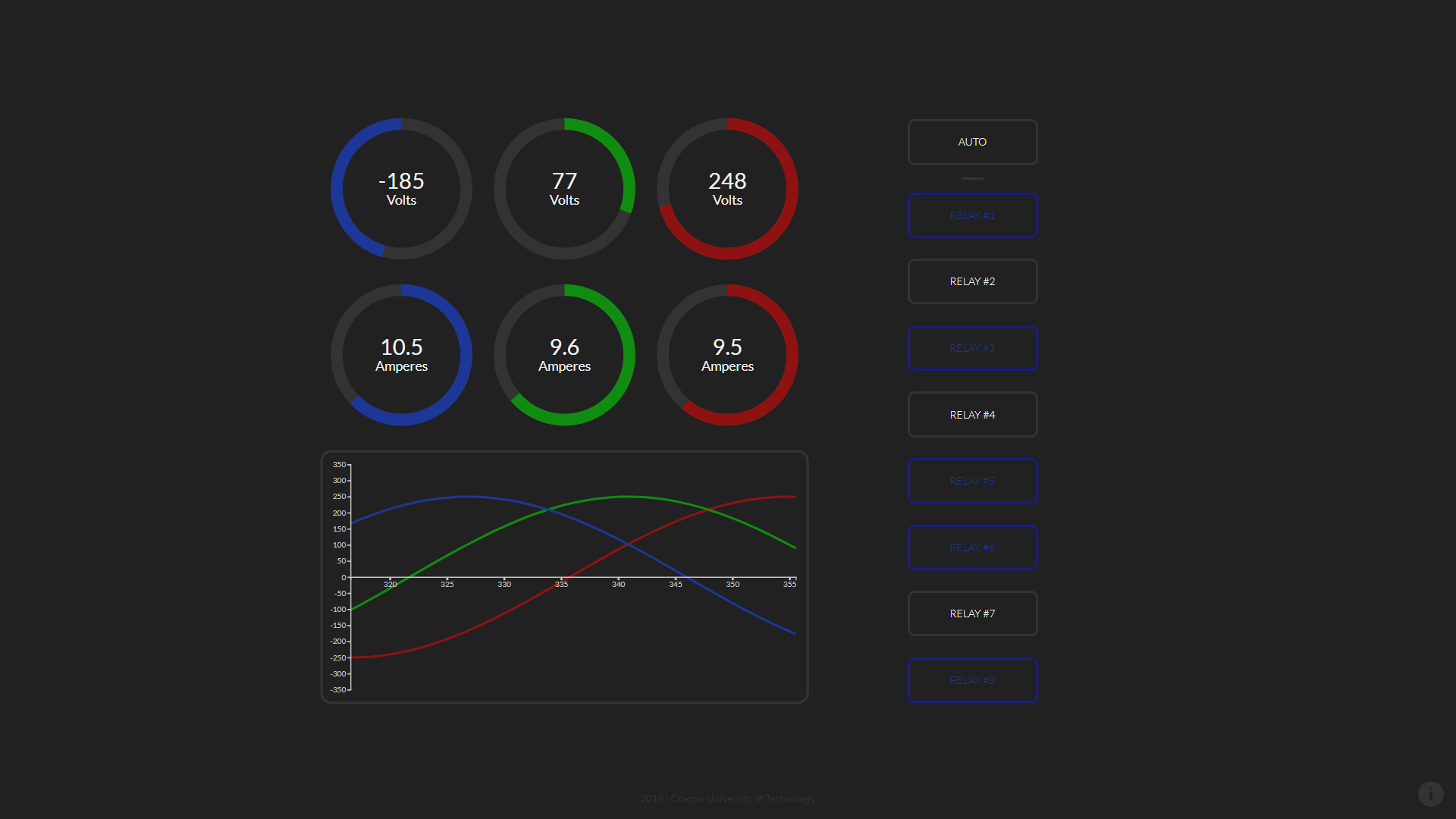 In this project we've created a gizmo which can gather data from a Three-Phase Electric Power. The input is then displayed in a form of the graphs (linear chart shows a value of each of the phase's voltage). A user can then track any occurring interference and set specific elements accordingly in order to compensate examined device. This can be achieved via switching certain buttons on the page. All the data is being sent using two WebSockets.