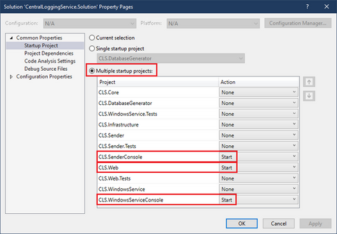 <ConnectionStrings>section you configured from theCLS.Coreproject and replace the existing<ConnectionStrings>sections in the App/Web.config files in the projects which will run at start up (seen in screenshot above), - Run the projects with 'F5'.