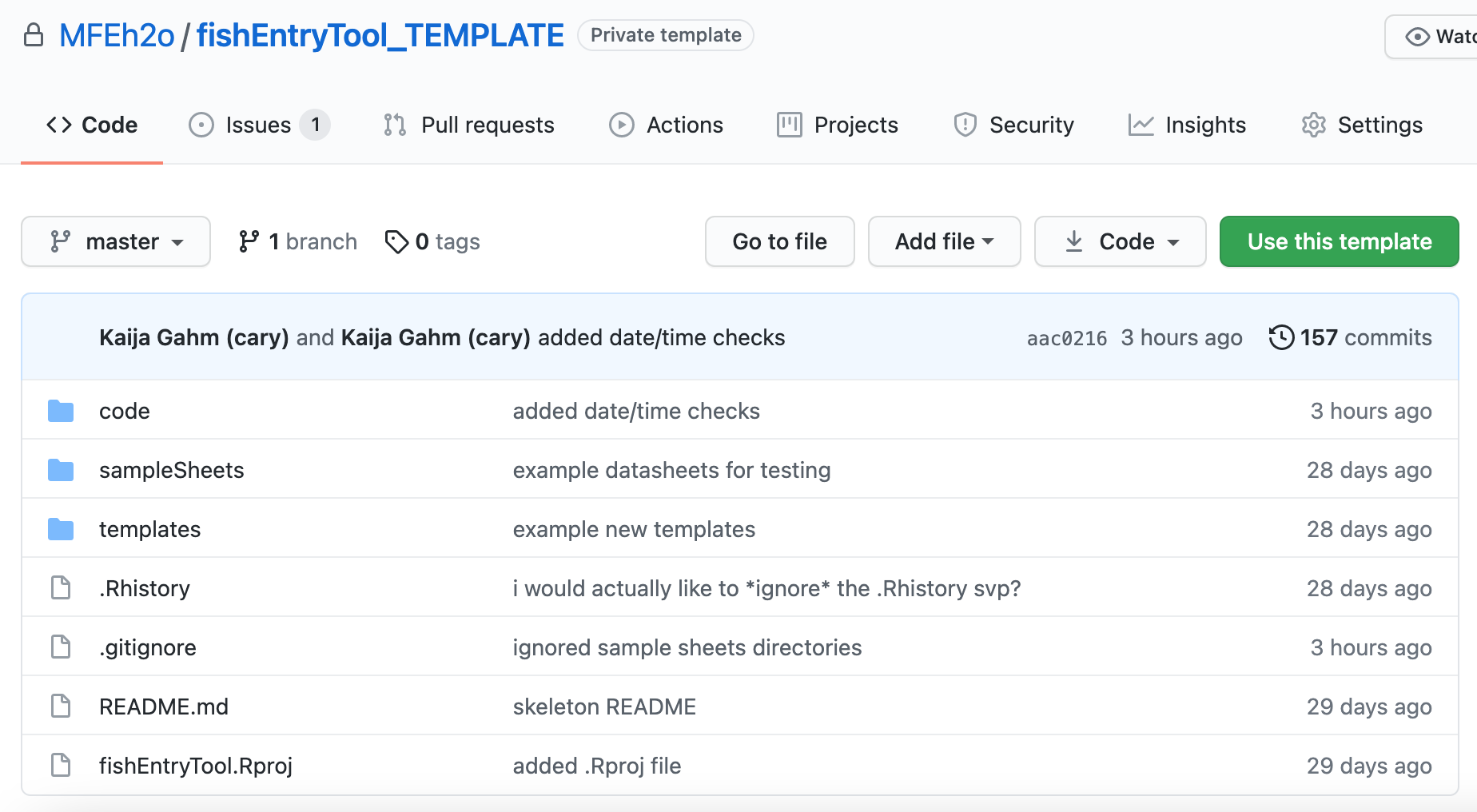 This template repository can and should be modified if you want to make changes to the entry tool itself. For example, if something about the tool is broken and needs to be fixed, you should clone the repository to your computer by creating a new R Project with version control and copy/pasting https://github.com/MFEh2o/fishEntryTool_TEMPLATE into the URL slot. Then you should make the code changes and commit/push them to modify the template. (Or you can fork the repo and work with pull requests--If you're modifying the template, I'm going to assume you know your way around GitHub).