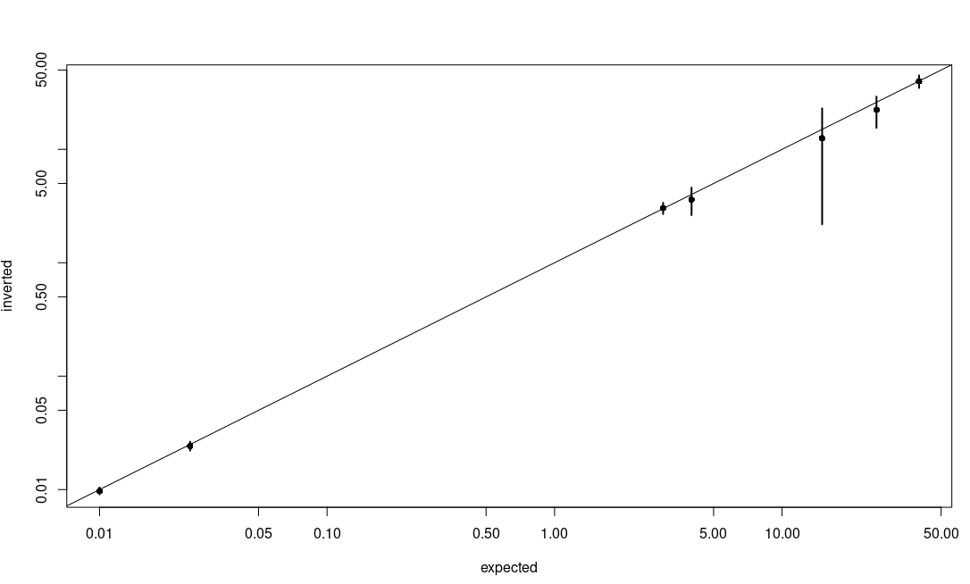 plot(parameters$prospectd,fit$mu,xlab="expected",ylab="inverted",pch=16,log="xy")