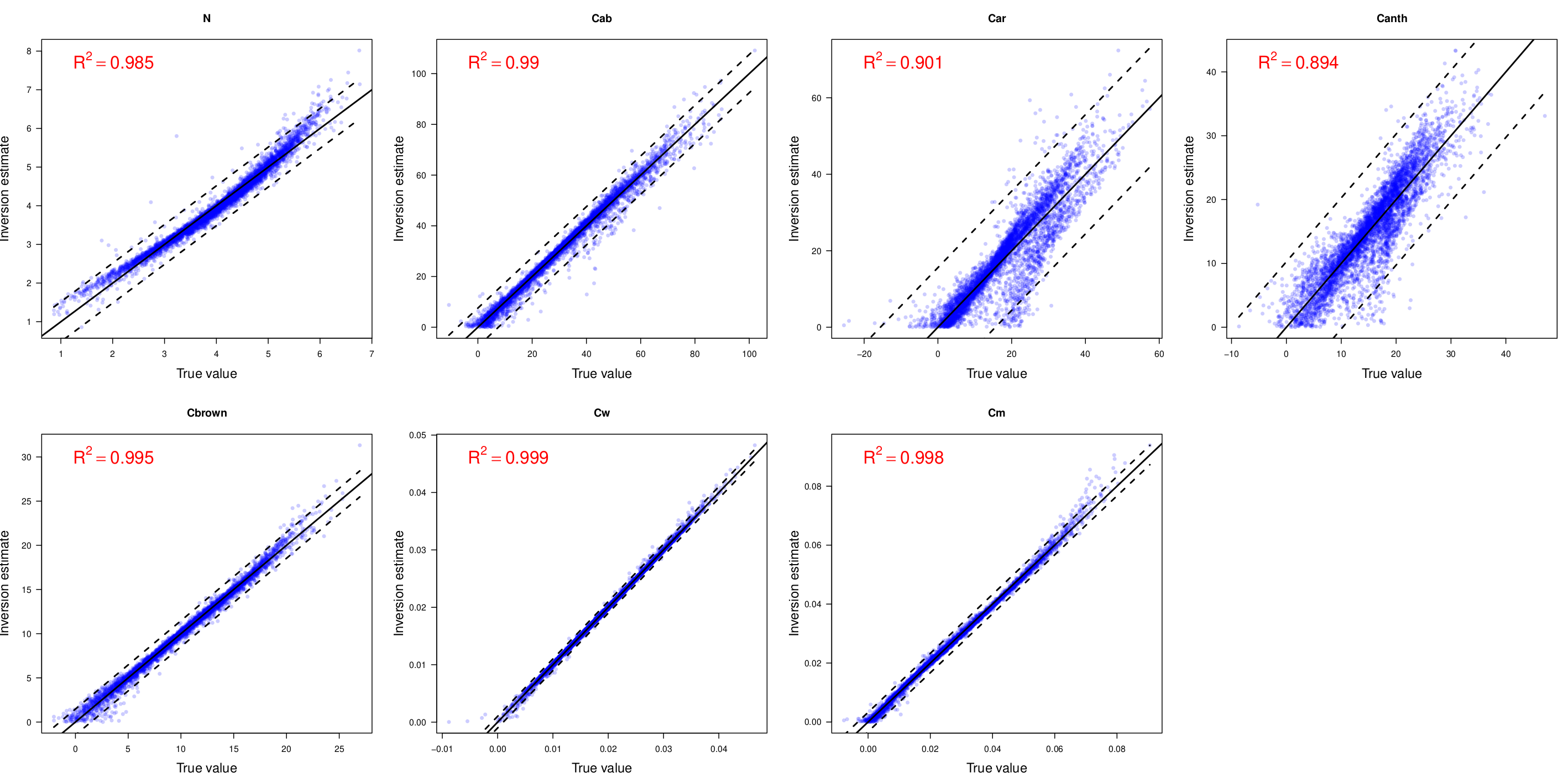 Inversion procedure uses a multivariate neural network (MANN), a partial least squares regression (PLSR) and a Bayesian weighting model to invert from spectra to traits. The MANN and PLSR are both used because their performace differs, with the one outperforming the other depending on the parameter. The Bayesian weighting model combines the predictions from the MANN and PLSR, and ensures that inversion uncertainty can be included (see examples above). Simulation results (below over 10000 simulations) show that the inversion routine works well.