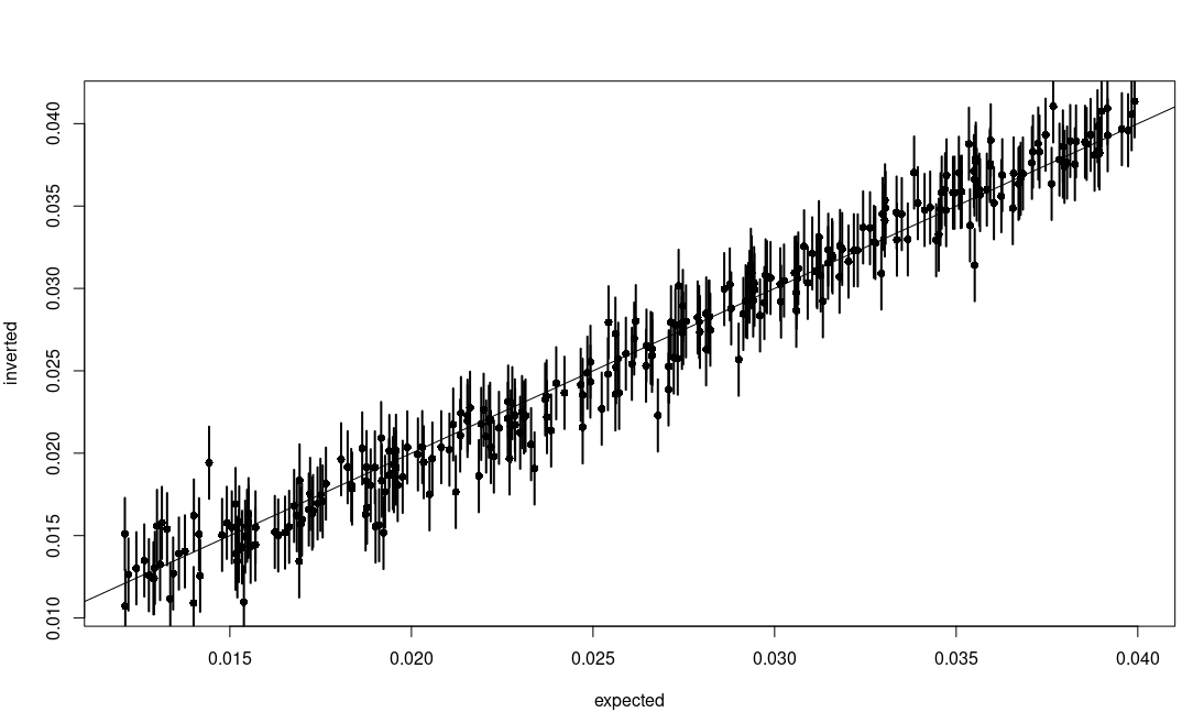 plot(parmat[,"Cm"],fit$mu[,"Cm"],xlab="expected",ylab="inverted",pch=16)