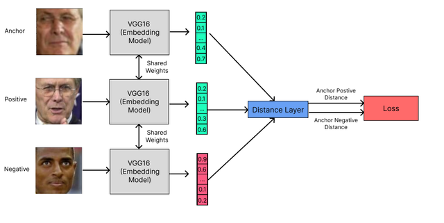 With this, the VGG16 network will be able to provide better embeddings. Embeddings that express unique features of the face that are different for every person. How Siamese model trains: