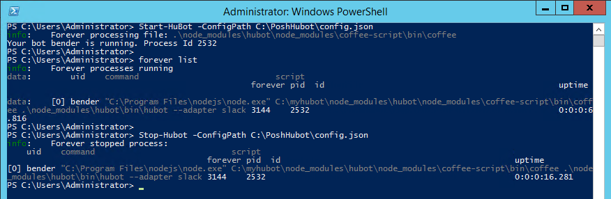 Start-Hubot -ConfigPath "C:\PoshHubot\config.json"Once the bot has been started, you can use the forever tool to view the status of the Hubot process.