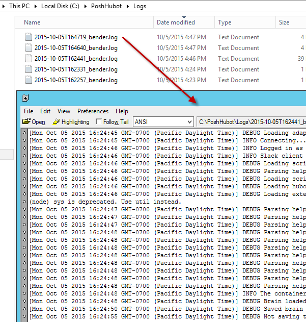 Stop-Hubot -ConfigPath "C:\PoshHubot\config.json"The PoshHubot script itself does not have any log files, but the Hubot does. These will be captured and logged.