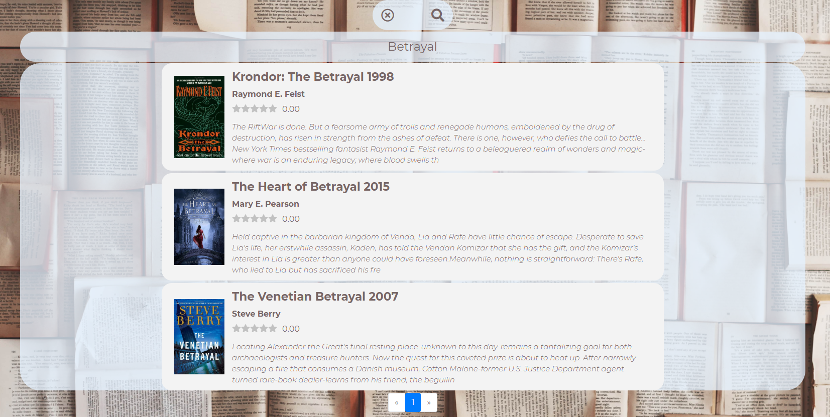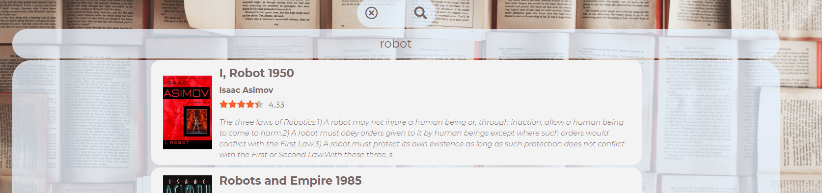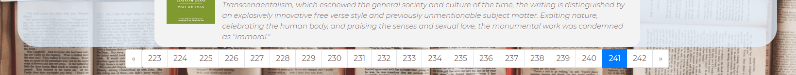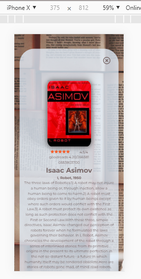20 books on one page and 20 pages. Pages can be switched by ArrayLeft / ArrayRight.The text and image for the books were taken from the goodreads website, using the small Python code I wrote (parc_img_text.py).