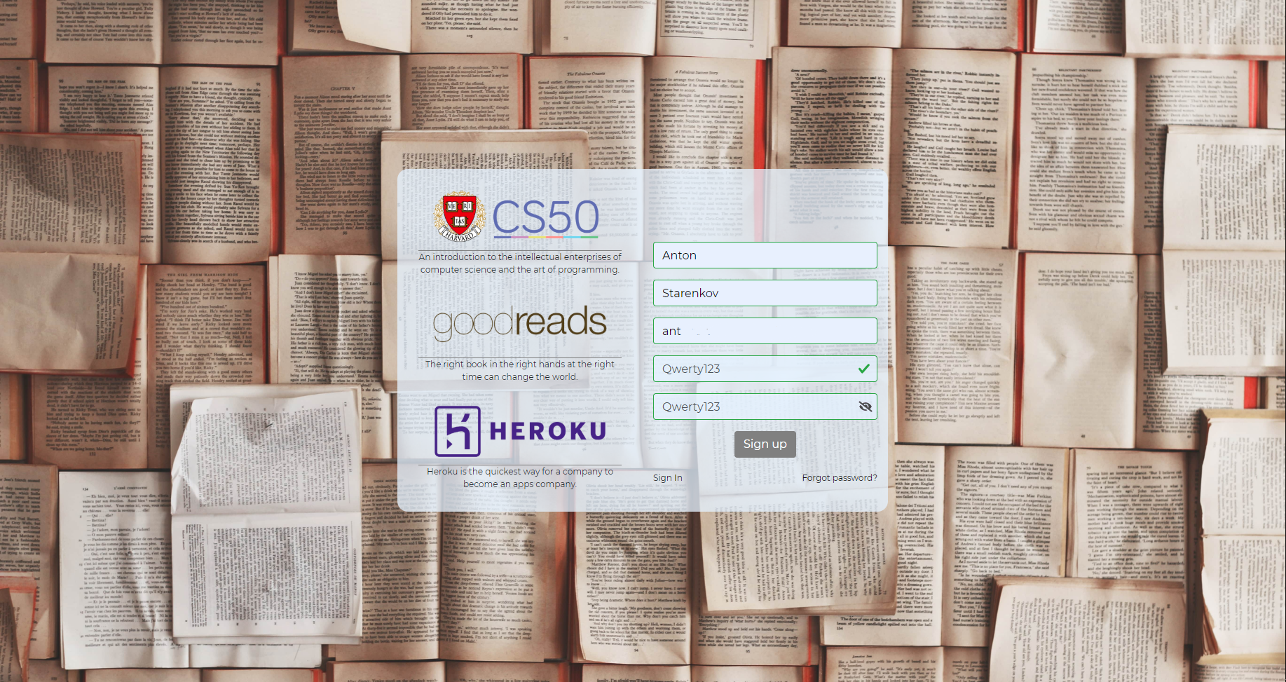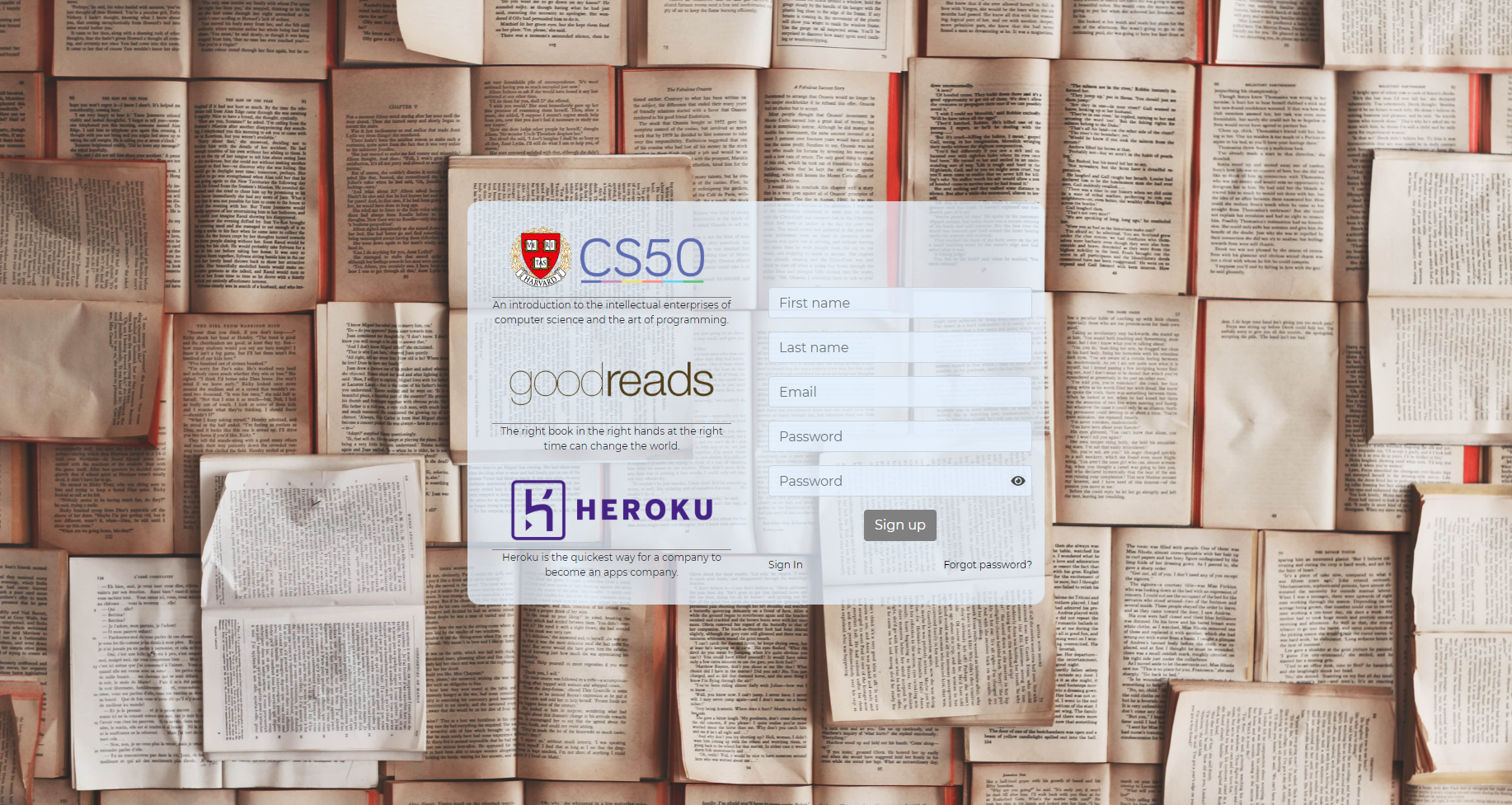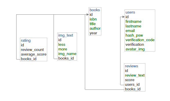 The main file that initializes the application. This file links the application, consisting of different files, into a single whole. Here are the keys to the Heroku database Goodreads URI APIs. To launch the application, use the commands: