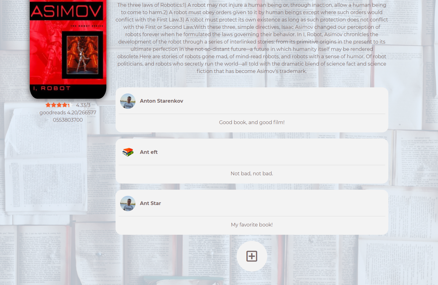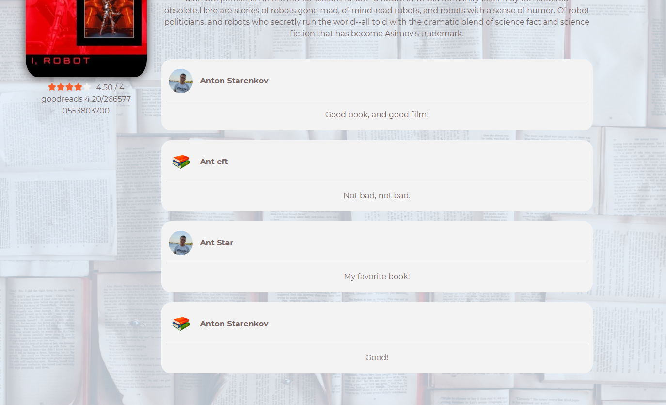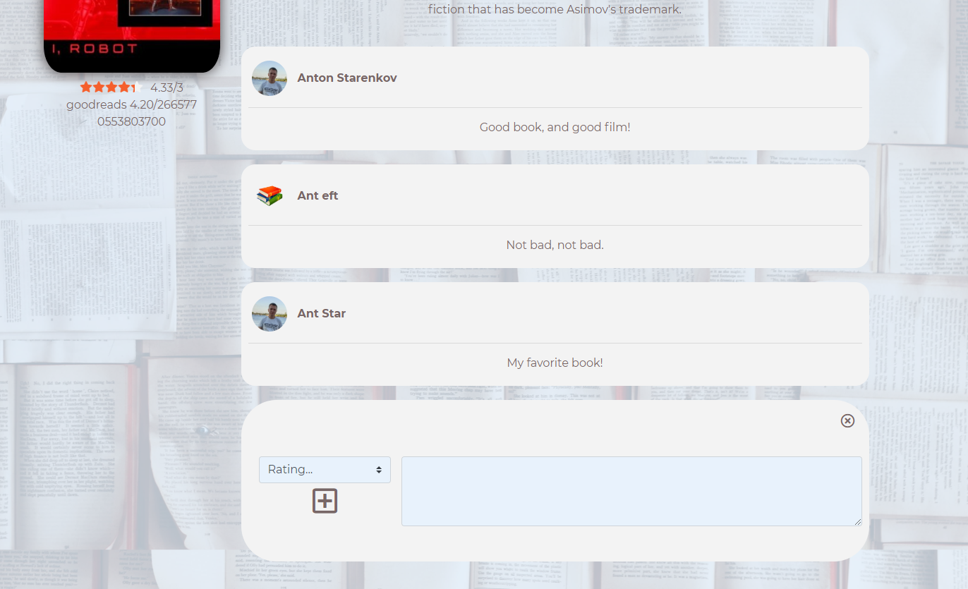 Pay attention to the rating of books according to goodreads (API). They are updated every time the page is refreshed.