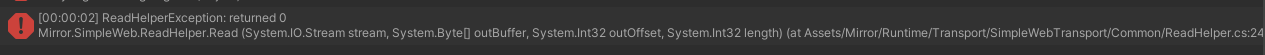 Mirror.SimpleWeb.ReadHelper.Read (System.IO.Stream stream, System.Byte[] outBuffer, System.Int32 outOffset, System.Int32 length) (at Assets/Mirror/Runtime/Transport/SimpleWebTransport/Common/ReadHelper.cs:24)