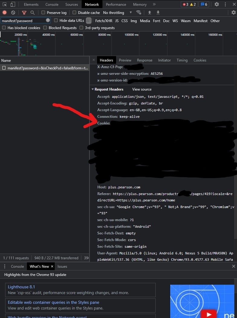 Now keep an eye out in developer tools for something starting with 'manifest?password'. Click on it, then look for the 'Request Header'.