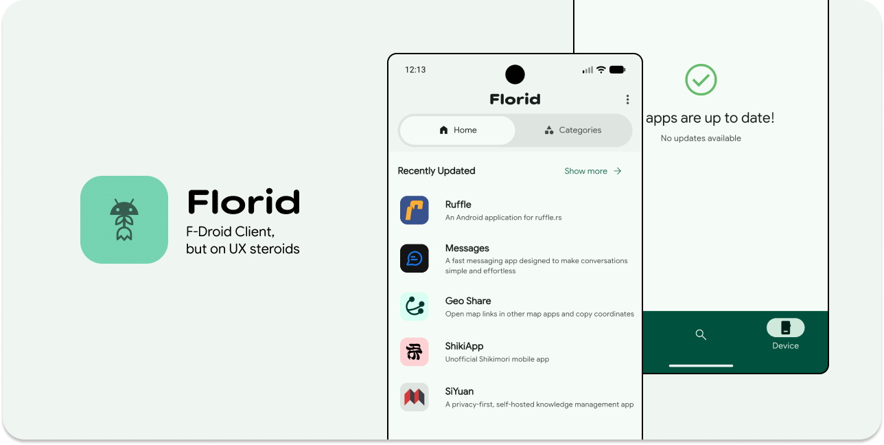 Florid is basically F-Droid client, but better looking? This project started out as a hobby or you can say an experiment. This app should be able browse, download & update apps from F-Droid. You might have a question, isn't there other client that does the job? Yes, but this is my take on the application from a UX designers perspective. This project would be UX first priority for me, so don't mind leaving your feedbacks on Github. This project might expand to allowing other repos like IzzyOnDroid.