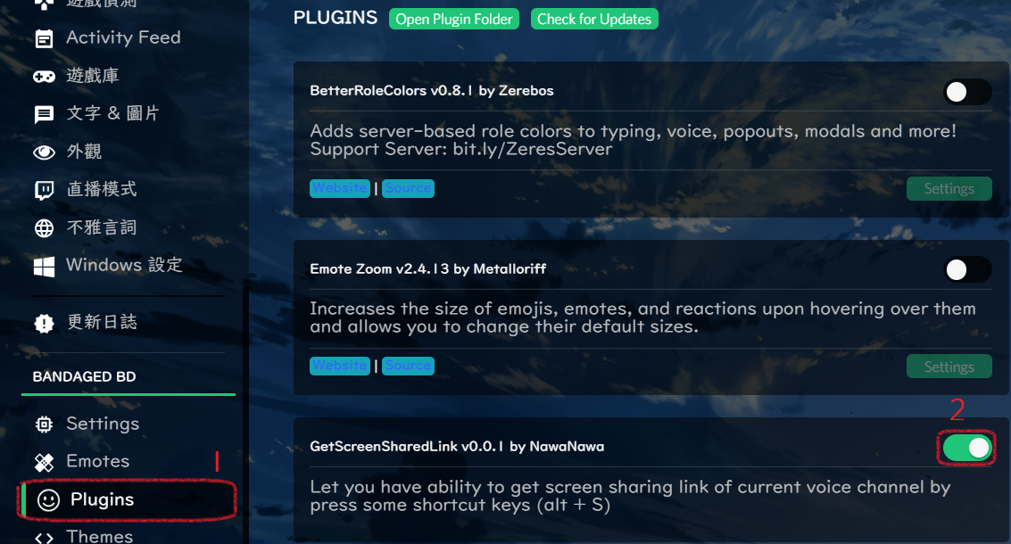 This is a BetterDiscord Plugin for Discord app. It helps you to get screen sharing link of current voice channel where you located by easliy press ==Alt+S== The Screen Sharing Link of your current voice channel will automatically copy to your clipboard after you press "Alt+s"