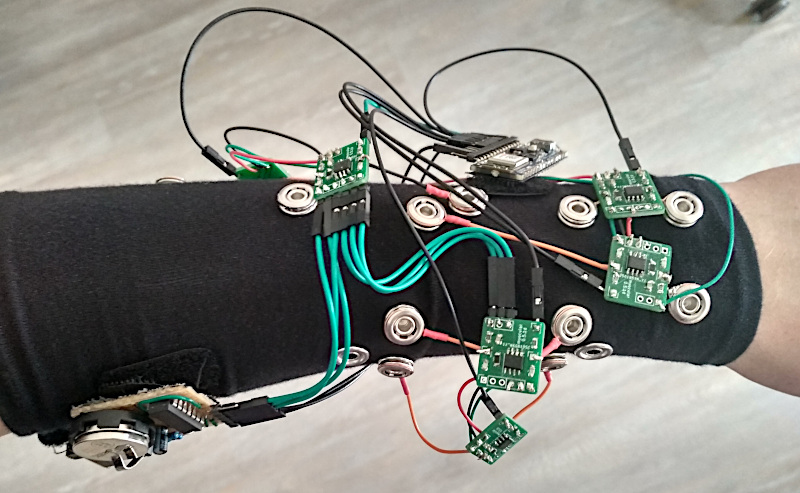 - A fabric glove/sleeve with a central component (arduino + power supply) and 8 distributed signal clean-up units close to individual electrodes.