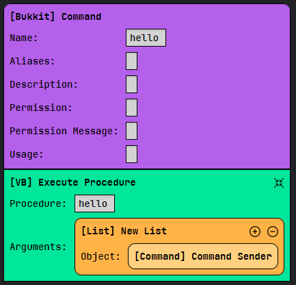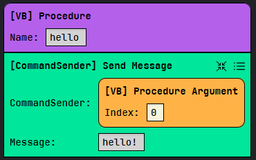 To define a procedure use the [VB] Procedure plugin component and set the name in the textfield then connect the blocks you want to be executed to the procedure block. Similar to command arguments, use the [VB] Procedure Argument block to access any arguments that are passed to the procedure (argument indices start at 0).