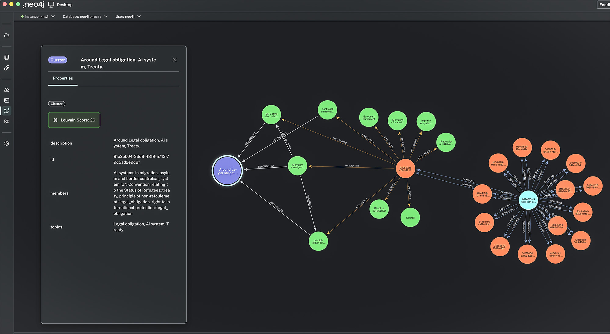 The Louvain algorithm automatically discovers clusters of related entities and an LLM labels each cluster with human-readable topics — giving you instant thematic insight into the document's structure.