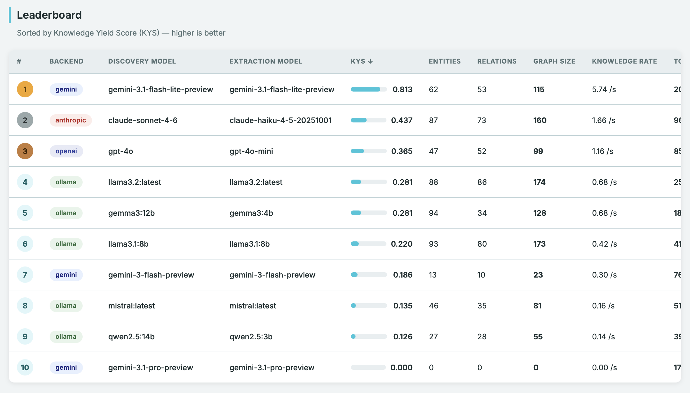 uv run main.py benchmark runThe benchmark uses a configurable grid of providers/models and computes a Knowledge Yield Score (KYS) — a combined metric of quality and speed. See Benchmark.