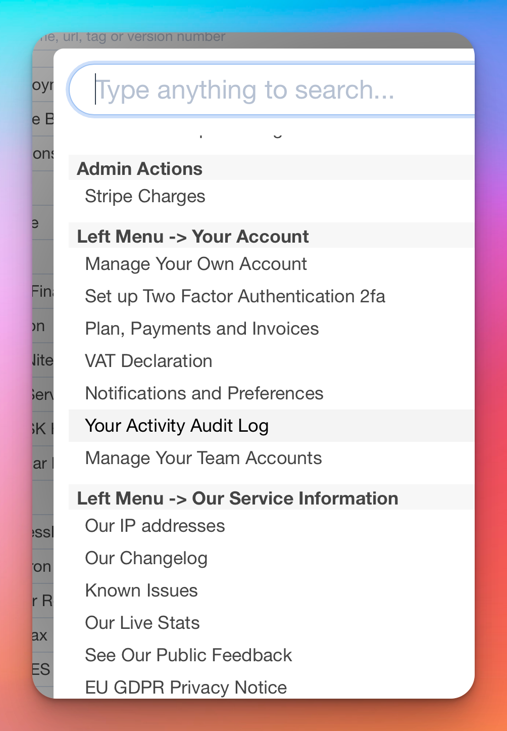 - Ability to group items. Like a Group of items replicating the main menu called "Main Menu" and a Group of items called "User Account" which contains things like password reset, 2fa and logout etc, and when filtered, for those bread crumb categories to be shown somehow like "User Account -> Set Up 2fa" see my crappy current implementation (my own js/css etc in screenshot)