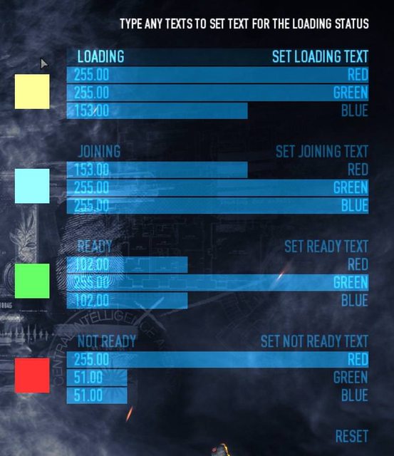 This mod is simply changes the status's colour & texts when a player that's in the Preplanning phase/Loading. For example, you can change READY status, NOT READY status, Joining status and Loading status from the white color to ANY COLOR you wanted.